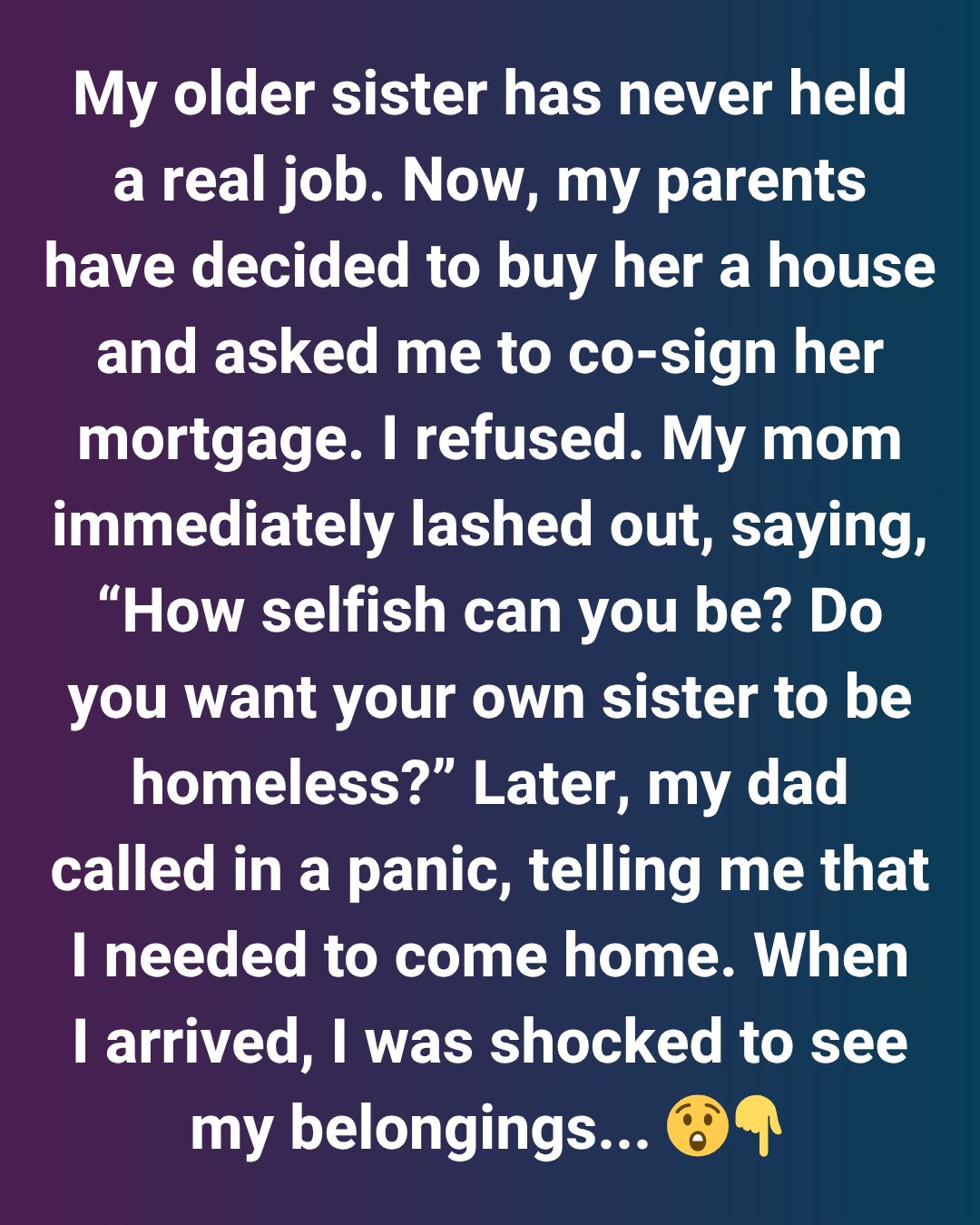 My older sister (27) has never held a real job—she’s always been financially dependent on our parents. Now, they’ve decided to buy her a house to “secure her future” and asked me to co-sign her mortgage since I’m financially stable.