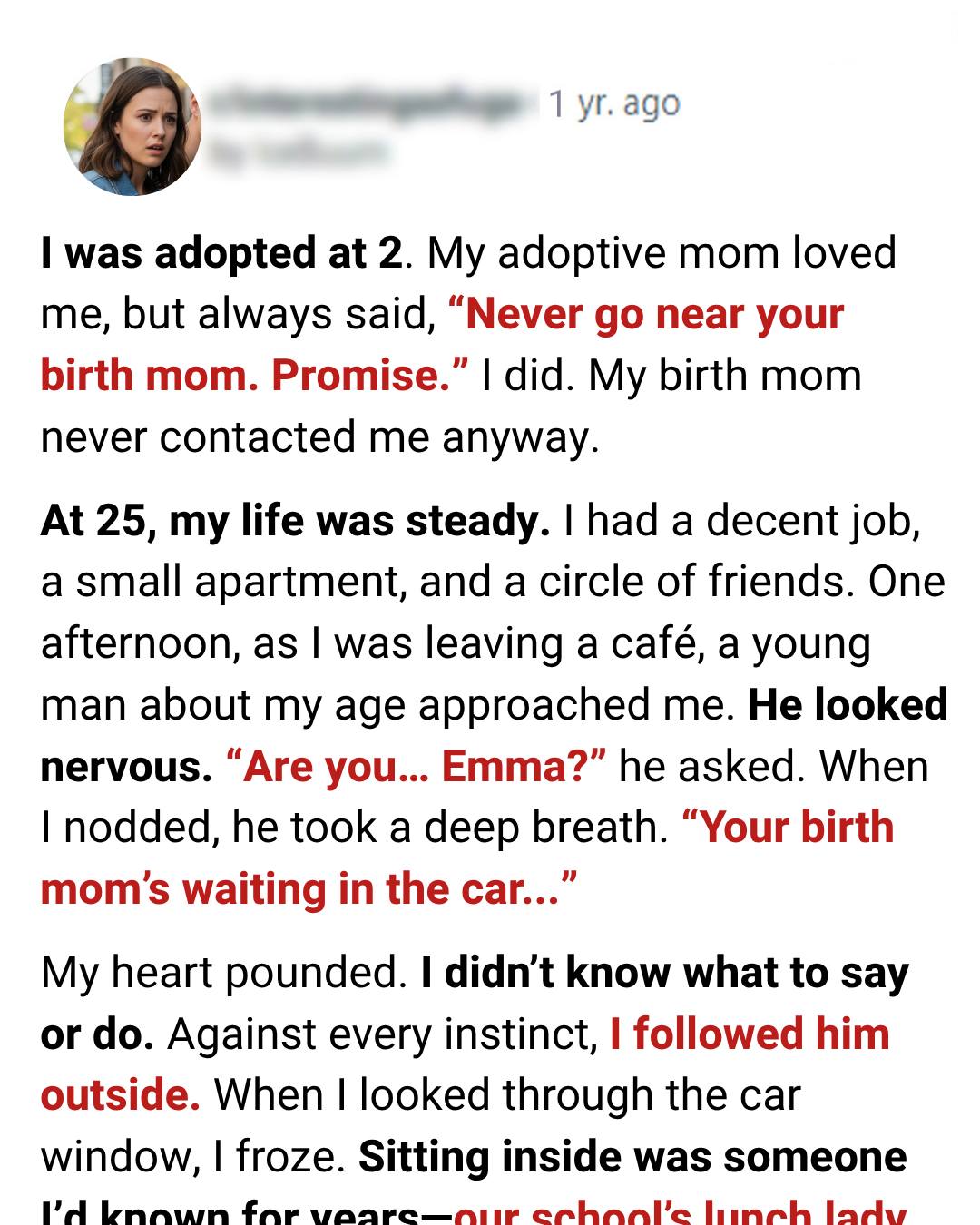 Then came the hardest truth: my adoptive mom had made her sign an agreement, a promise never to contact me. “She said she’d only adopt you if I disappeared from your life completely,” my birth mom said through tears. “I agreed because I thought you’d have a better life. But I couldn’t stay away.”