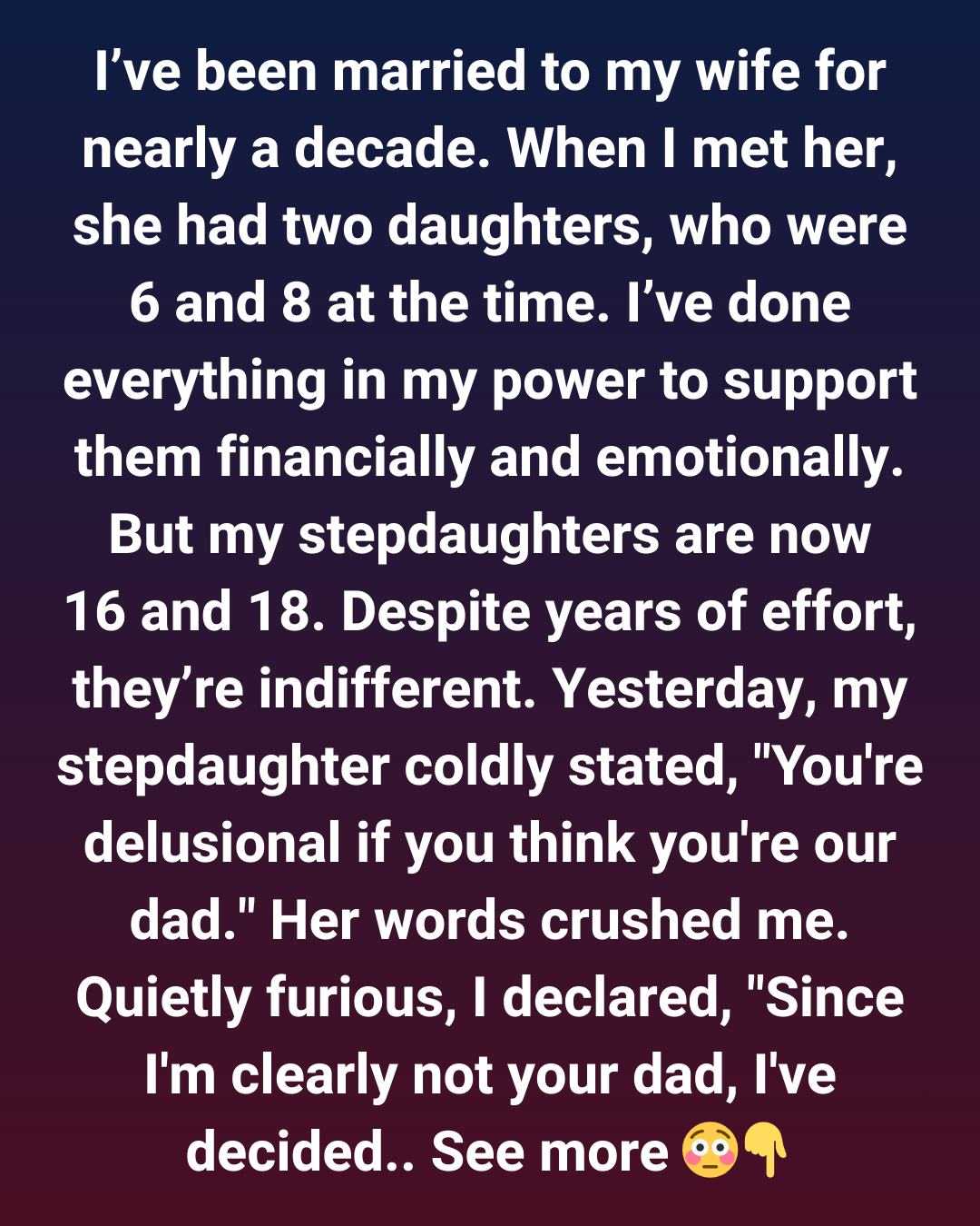 But my stepdaughters are now 16 and 18. Despite years of effort, they’re indifferent. No matter how much love and dedication I showed, there was always a barrier. Julia always assured me they’d come around eventually, but after ten years, I felt like nothing had changed.