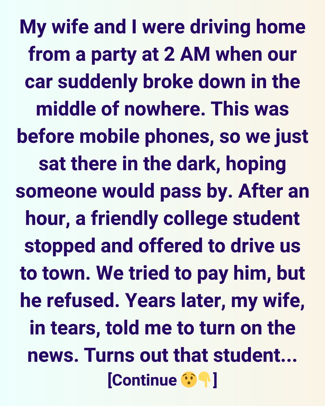 Years later, my wife called me, almost in tears, and told me to turn on the news. There he was — the same “college student,” now wearing a sharp suit and standing behind a podium. He wasn’t a student anymore… he had become a tech millionaire and philanthropist, famous for secretly helping strangers in need.