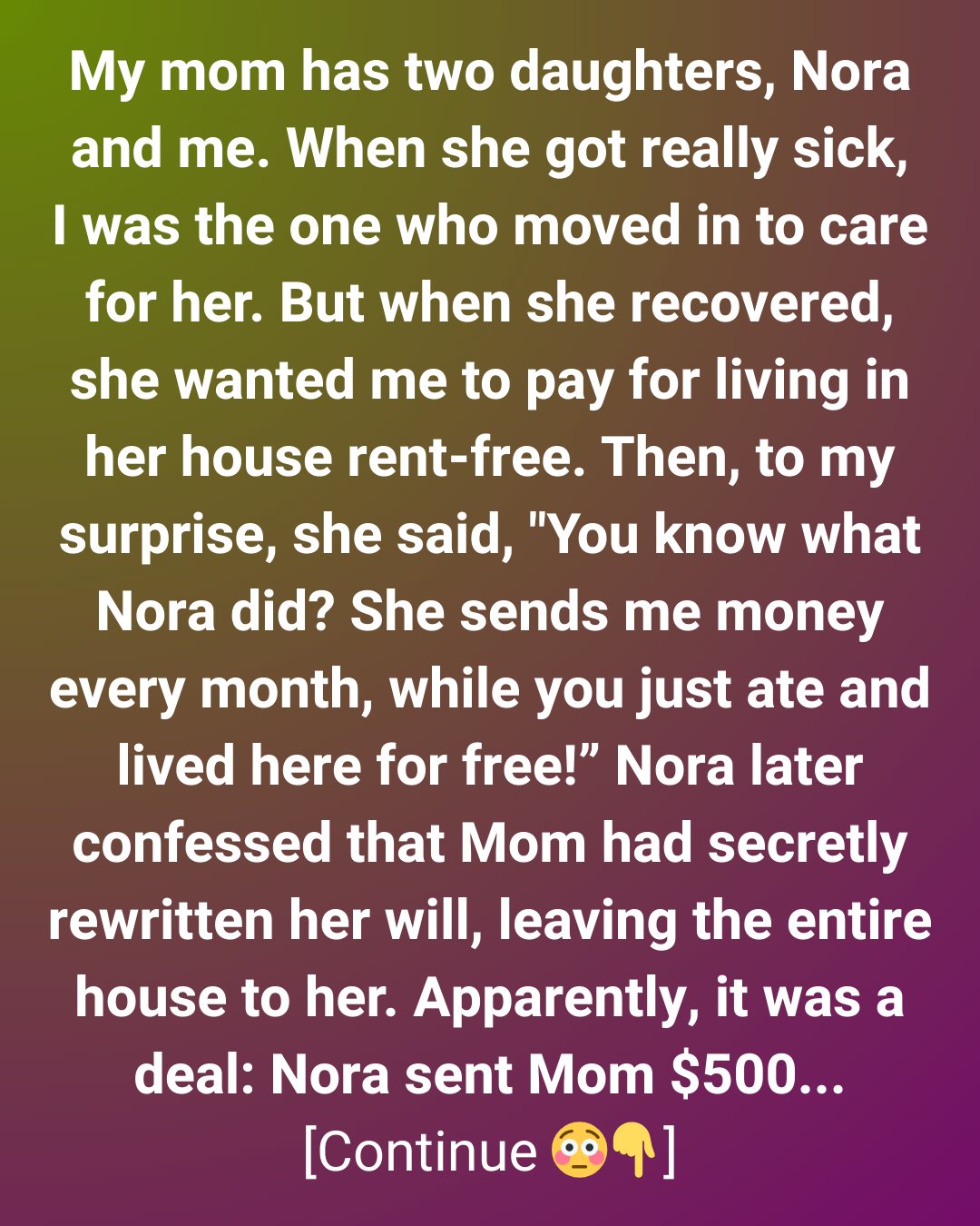That alone stung, but it didn’t stop there. Later, Nora admitted that Mom had secretly rewritten her will, leaving the entire house to her. Apparently, it was a deal: Nora gave Mom $500 a month, and in return, Mom promised her everything. Nora confessed it didn’t feel right and thought I deserved to know.