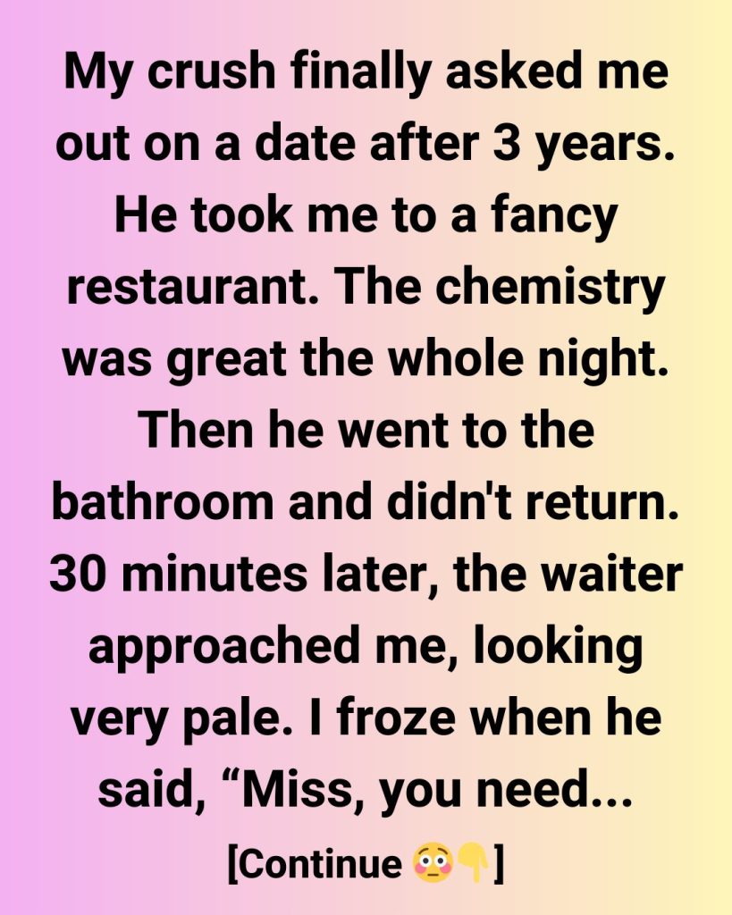 Then, he went to the bathroom and didn’t return. Thirty minutes later, the waiter approached me, looking very pale. I froze when he said, “Miss, you need to cover the bill.”