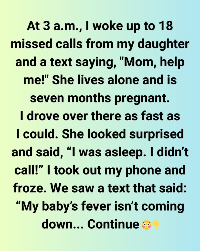 At 3 a.m., I woke up to 18 missed calls from my daughter and a text saying, “Mom, help me!” She lives alone and is seven months pregnant. I drove over there as fast as I could. She looked surprised and said, “I was asleep. I didn’t call!”