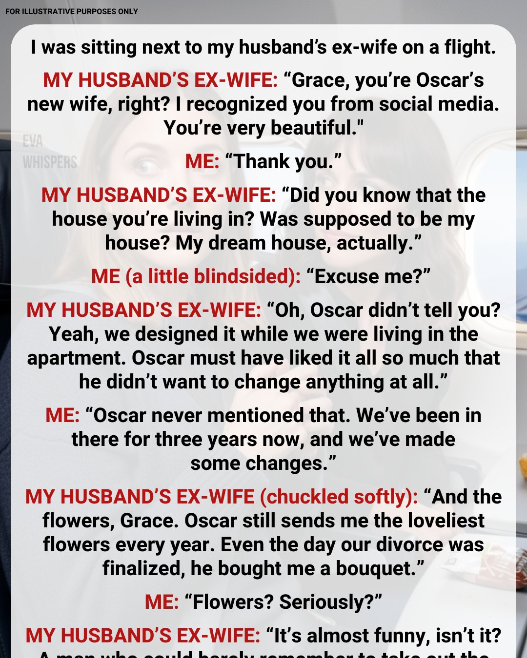 For the rest of the flight, I stared blankly at the seat in front of me, my mind replaying every moment of my marriage—now poisoned by her revelations.