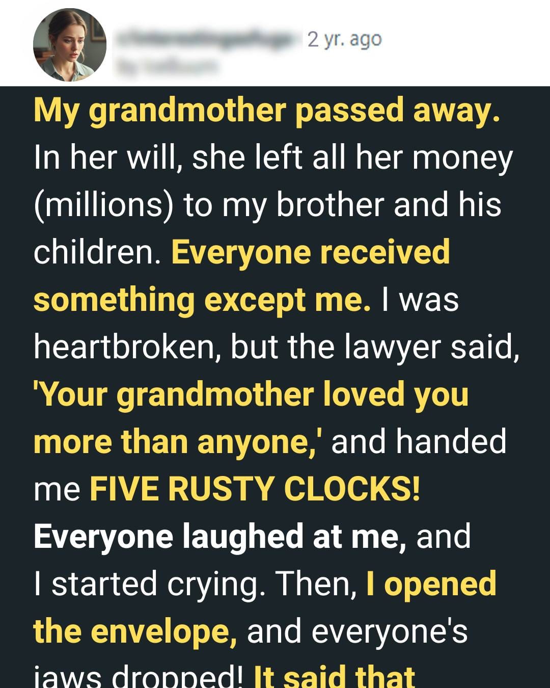 Suddenly the rusty clocks didn’t look so ridiculous. I remembered polishing them with her when I was a child, the stories she told, the afternoons we spent together while the rest of the family was “too busy.” I remembered how she always smiled at me with a secret warmth no one else seemed to earn.