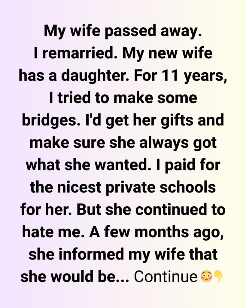 When we got married, my boys were 13 and 9, and my stepdaughter was 12. From the start, I did everything I could to build a bridge with her. I bought her gifts, supported her at school and extracurriculars, and tried to make sure she always had what she wanted. I drove her to school, paid for her private education, and worked tirelessly so that all three kids—my sons and her—could have a good life. My wife chose to be a housewife after leaving her job, so I carried the financial load.