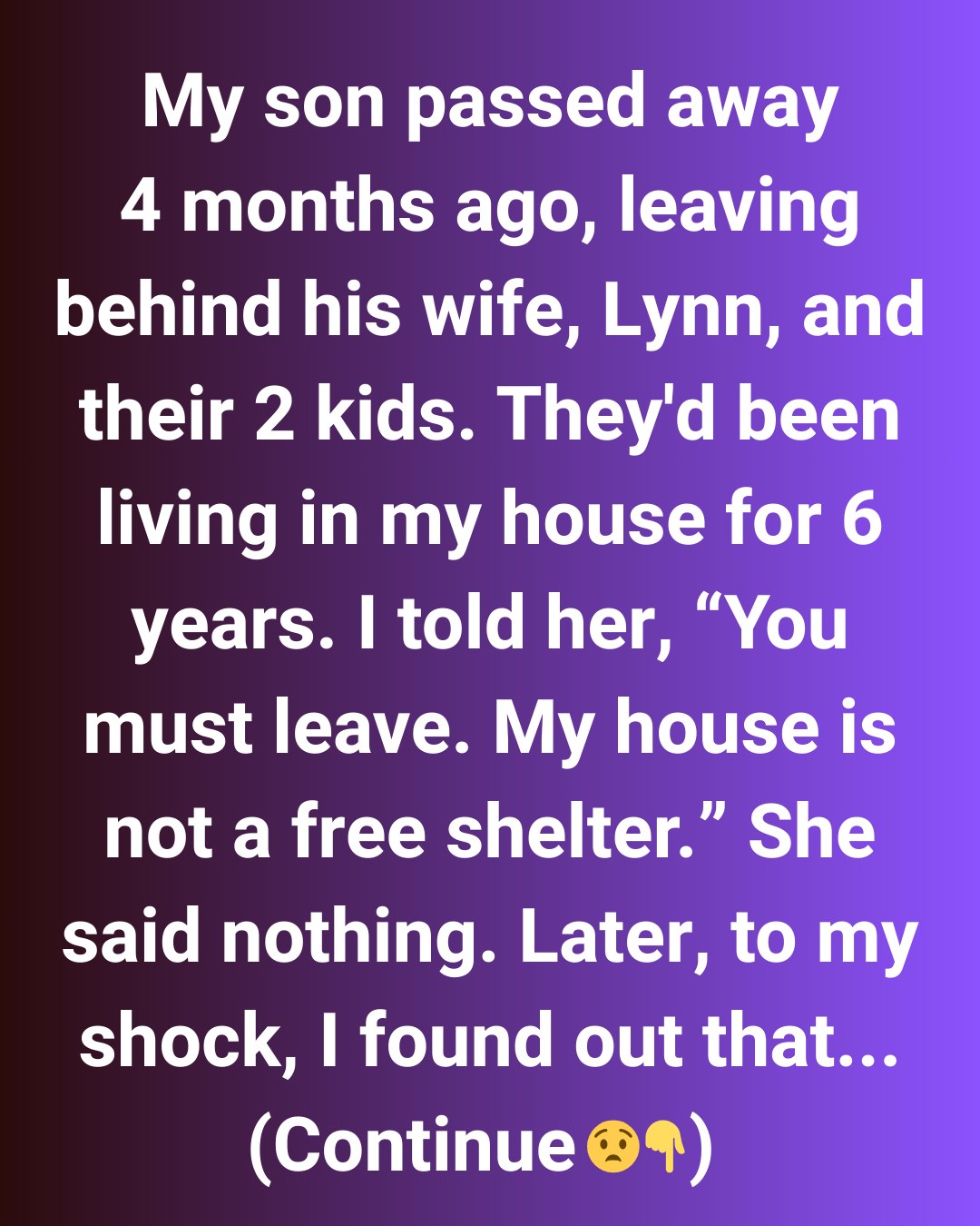 My son Jake (35) d.ied in a car accident four months ago. He left behind his wife, Lynn (31), and their two young sons — Ben (5) and Harry (3). For the past six years, they’d all been living in my home.