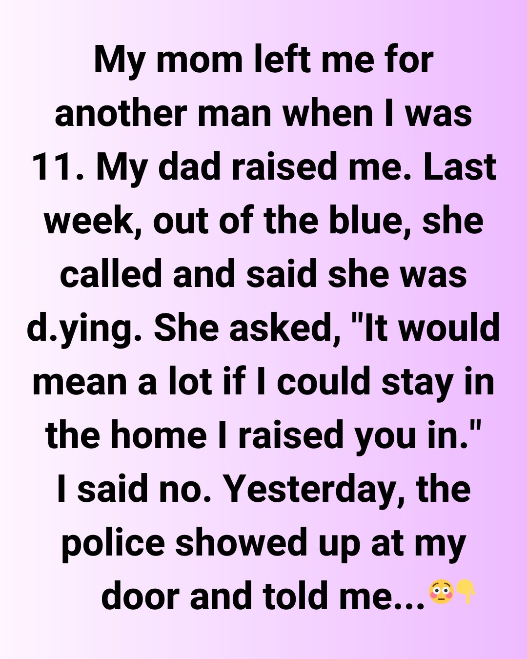 She continued: “It would mean a lot to stay in the home I raised you in.” I declined, telling her, “You did not raise me.” “You left.” She cried, accusing me of being harsh. That I am her only child.