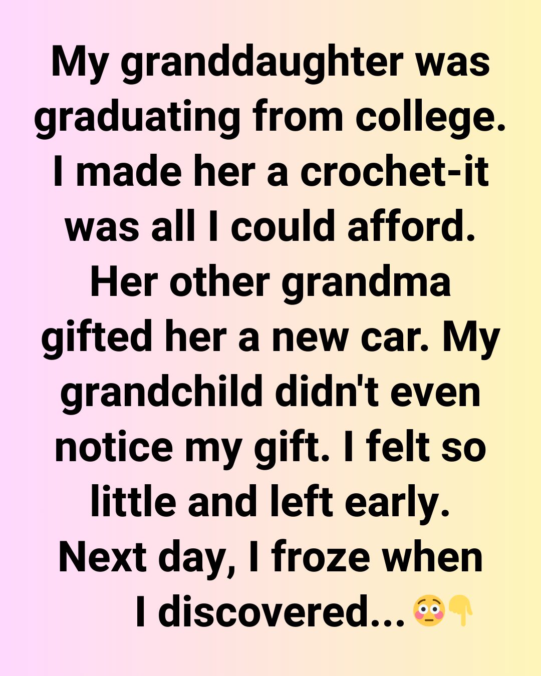 My granddaughter was graduating from college. I made her a crochet; it was all I could afford. Her other grandma gifted her a brand-new car. My granddaughter didn’t even notice my gift. I felt so small and left early.