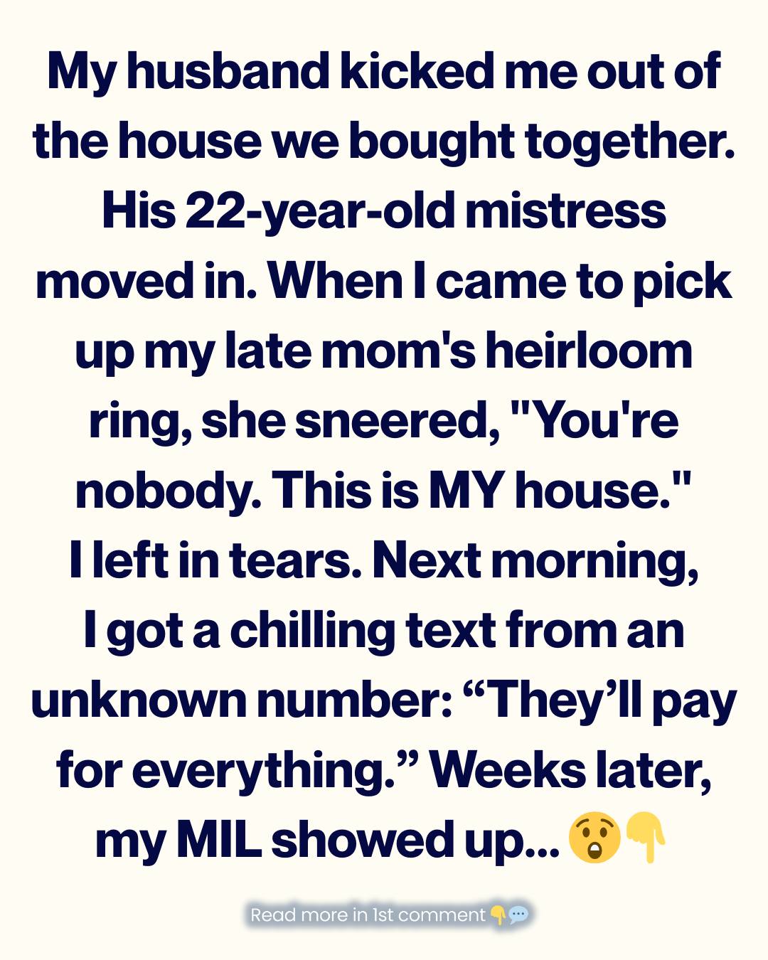 Two days later, I returned with the spare key to grab my late mom’s heirloom ring—one of the few things that truly mattered to me. But when I opened the door, the mistress blocked my path.