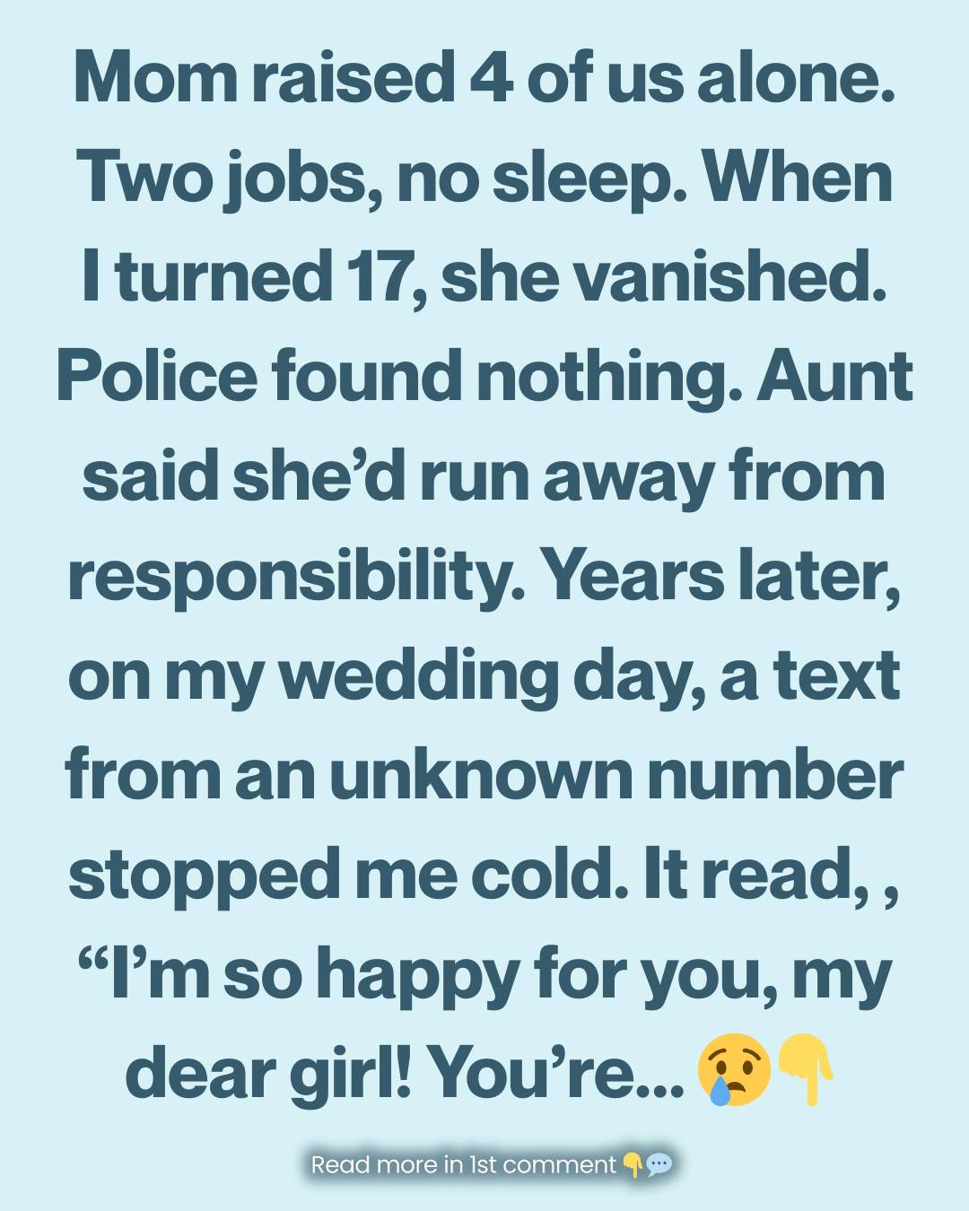 Mom raised the four of us on her own. Two jobs, endless overtime, barely a moment of sleep. I grew up watching her hands tremble from exhaustion, yet she never once complained. She was the strongest person I knew—until the day she vanished. I was seventeen. One morning she simply wasn’t there. No note, no call. Just silence.