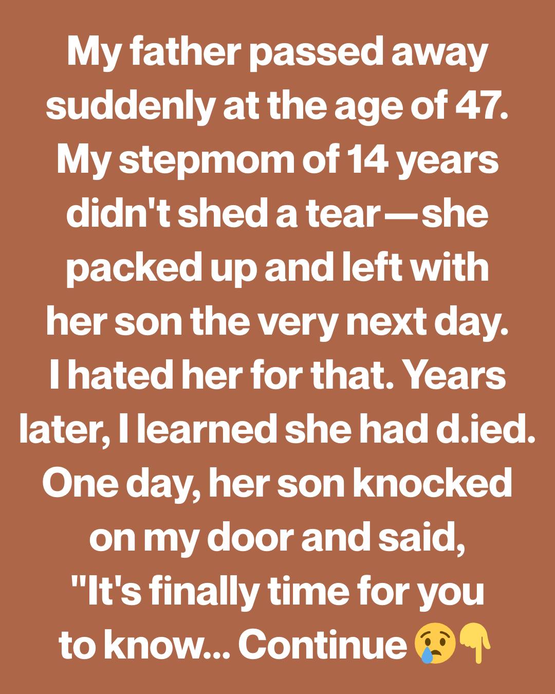 My stepmom of fourteen years didn’t shed a single tear. At least, not that I ever saw. The very next morning, she packed up her belongings, took her son, and walked out of our home without looking back. No explanations. No goodbye. Nothing. I stood in the doorway, watching her leave, and a cold bitterness settled into my chest. I hated her for that moment. I hated her for abandoning me when I needed her most.