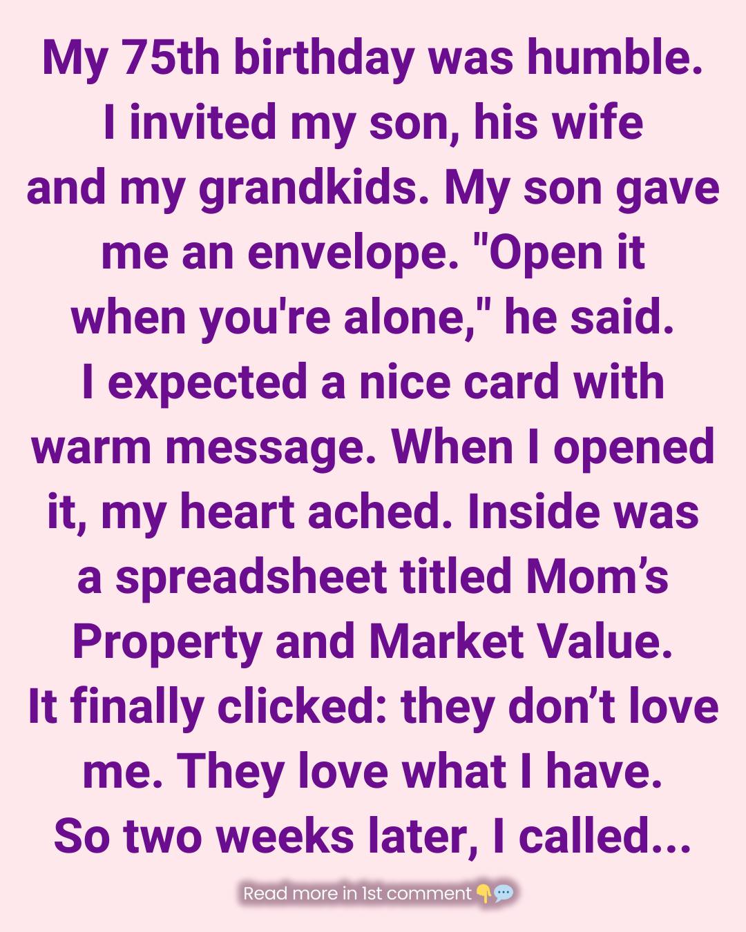 Later that night, I opened it. It wasn’t a card at all. It was a spreadsheet titled “Mom’s Property and Market Value.” Every possession I own—my house, jewelry, even my small stock portfolio—had notes about who should get what. Everything neatly itemized like I was a storage unit they were planning to empty.