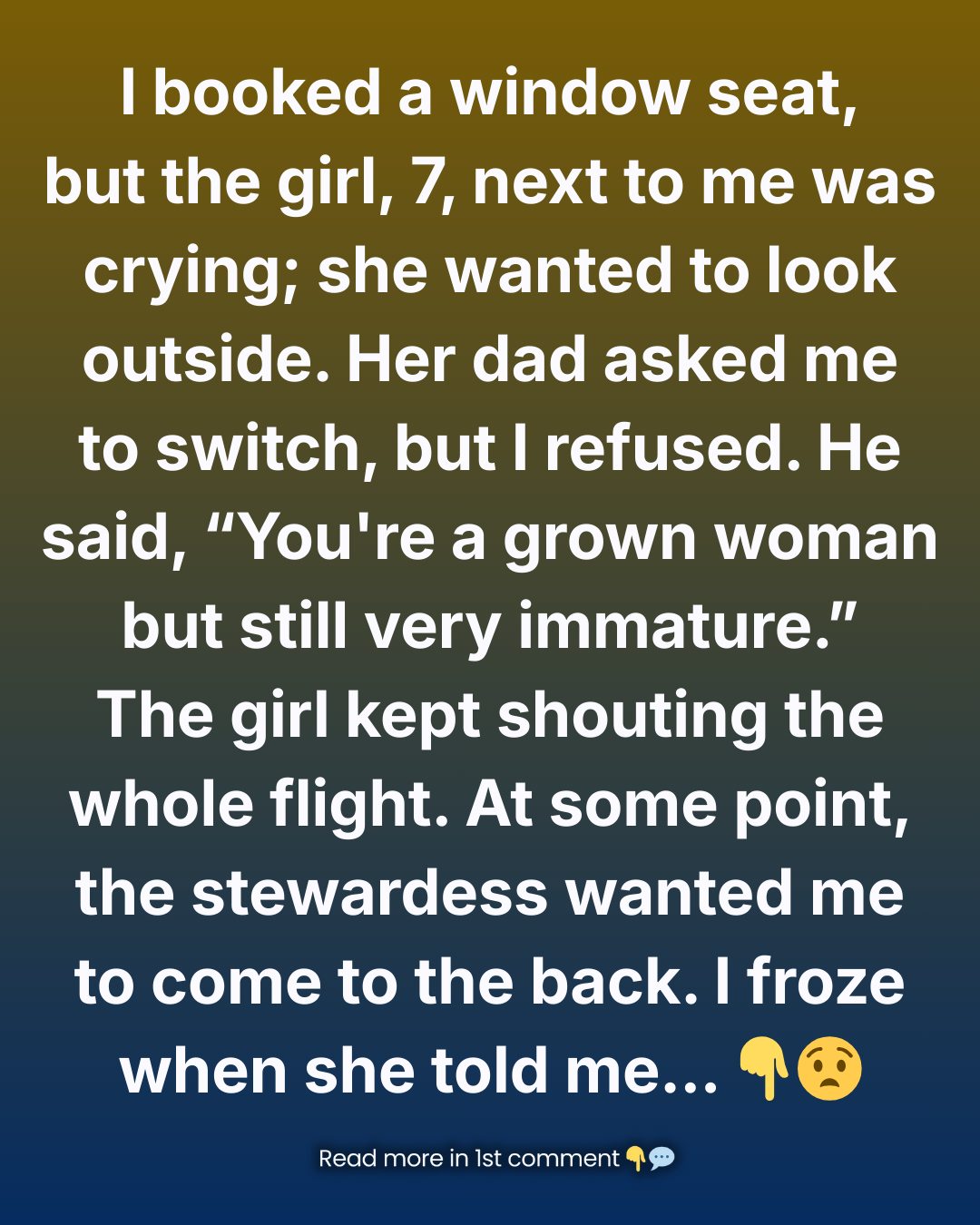 I had specifically booked a window seat for my flight. I’m the kind of traveler who likes watching the world shrink beneath the clouds, so I always make sure to reserve that spot. But as soon as I sat down, the little 7-year-old girl next to me burst into tears. She kept insisting she had to look outside, and her father immediately leaned over and asked if I could switch seats with her.