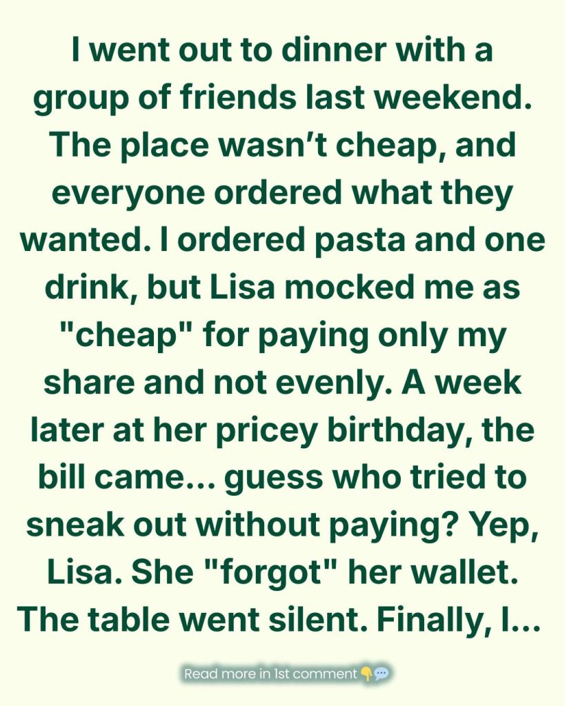 At first, I forced a laugh, hoping she was joking. But then she leaned forward, her voice loud enough that people at nearby tables turned to look. “Seriously, if you can’t afford to eat out, maybe you shouldn’t come.”