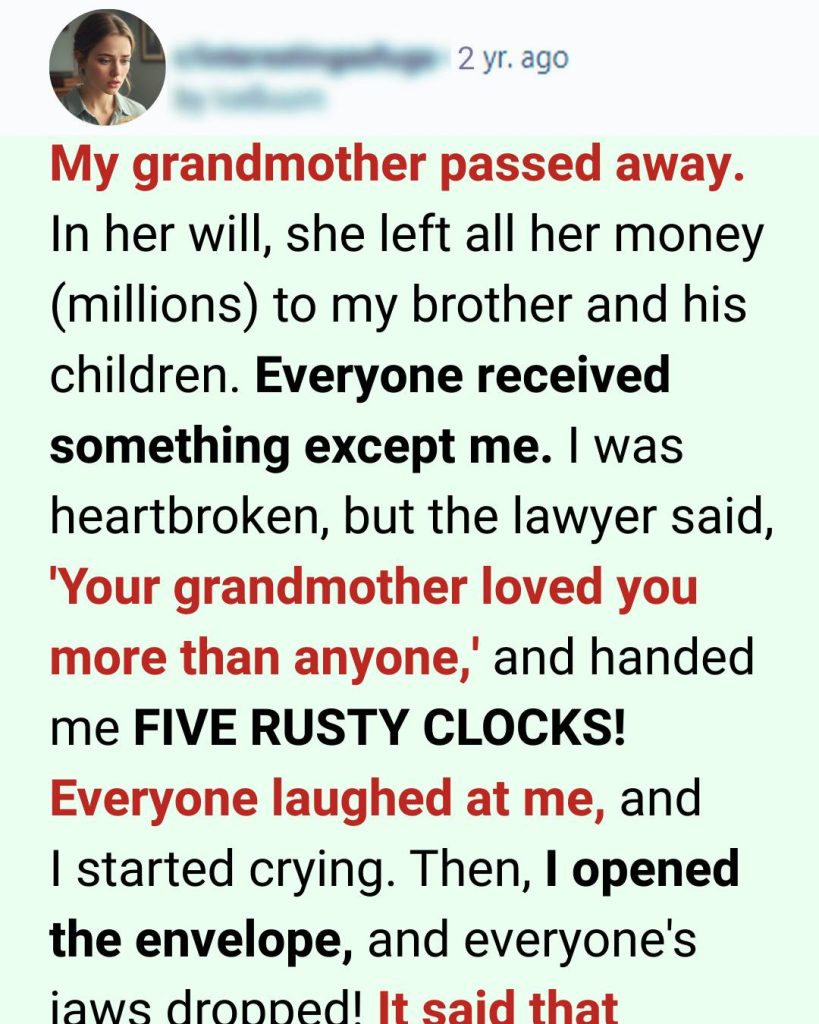 Suddenly the rusty clocks didn’t look so ridiculous. I remembered polishing them with her when I was a child, the stories she told, the afternoons we spent together while the rest of the family was “too busy.” I remembered how she always smiled at me with a secret warmth no one else seemed to earn.