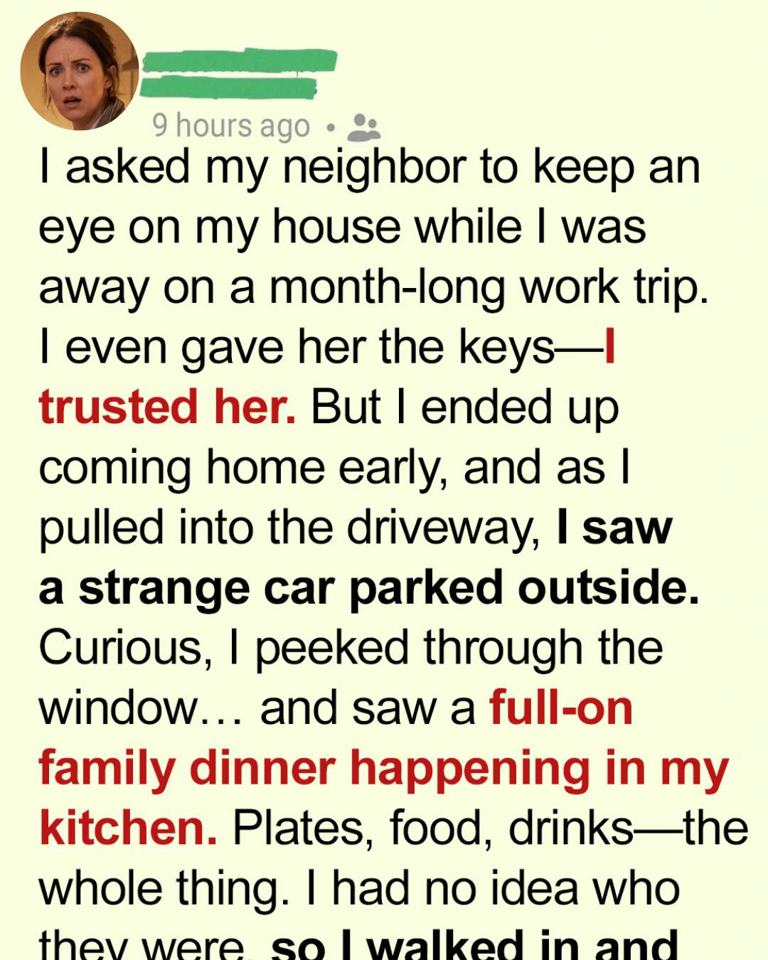 I left for a month-long work trip, trusting my neighbor and friend to watch my house. But when I returned early, I found a strange car in the driveway… and a family of strangers eating dinner in my kitchen!