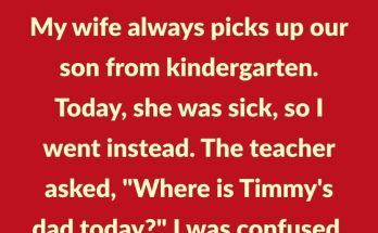 My wife always picks up our son from kindergarten. Today, she was sick, so I went instead. The teacher asked, “Where is Timmy’s dad today?” I was confused. Then, a …