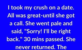 I took my crush on a date. All was great—until she got a call. She went pale and said, “Sorry! I’ll be right back.” 30 minutes passed. She never returned. …
